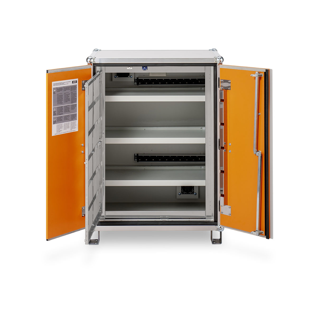 Feuer- und Explosionswiderstandfähiger Sicherheitsschrank, der speziell zur Lagerung und Laden von Lithium-Ionen-Batterien geeignet ist. zertifiziert nach VDMA Einheitsblatt 24994:2024-08 sicheres Lagern und Laden von Lithium-Ionen-Batterien bis 3 kWh – ideal für Anwendungen mit hohem Energiebedarf. höchste Sicherheit im Brandfall – hält einem Batteriebrand stand und gewährleistet kein Austreten von Flammen und Funken. modulares Baukastensystem – kombinier- und stapelbar mit weiteren lockEX-Baureihen für maximale Flexibilität und Erweiterbarkeit. patentrechtlich geschütztes Druckentlastungssystem lockEX propagationsverhindernde Lagerebenen – verhindern die Ausbreitung von Bränden zwischen einzelnen Batteriemodulen. Anbindung an zentrale Brandmeldeanlage (BMA) – für nahtlose Integration in bestehende Sicherheitsinfrastruktur. flexibel vernetzbares System – Kommunikation wahlweise über WLAN oder SMS für maximale Erreichbarkeit, auch ohne Internetverbindung